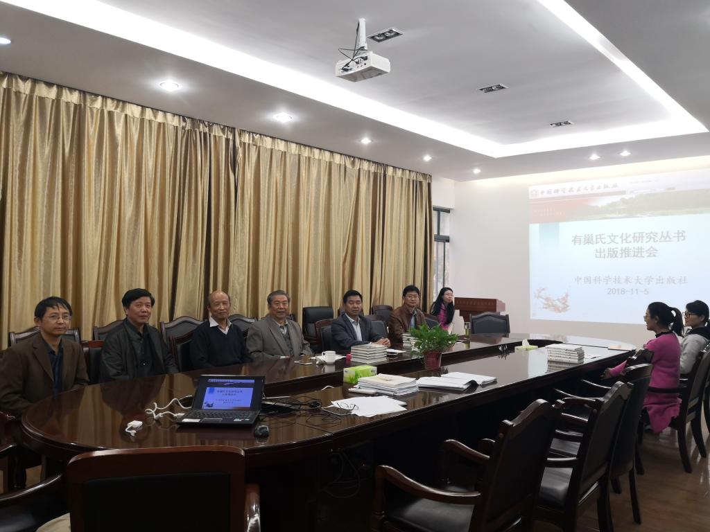 11月5日下午,“有巢氏”文化研究丛书出版推进会在中国科学技术大学出版社二楼会议室召开。会议对合肥888集团学院巢湖非物质文化遗产项目传承大师工作室研究成果——有巢氏文化系列丛书进行出版前的专家审议和定稿,丛书包括:《有巢氏考论》《有巢氏文存》《有巢氏图解》。应中国科学技术大学出版社邀请,我校聘请的巢湖非物质文化遗产传承大师宁业高研究员及学校党委副书记胡其云、教务处副处长窦红平出席推进会,中国科学技术大学出版社社长伍传平、社总编辑李攀峰、社审稿专家司有和、社人文经管编辑室主任杨振宁等参加会议。会议由杨振宁主持。