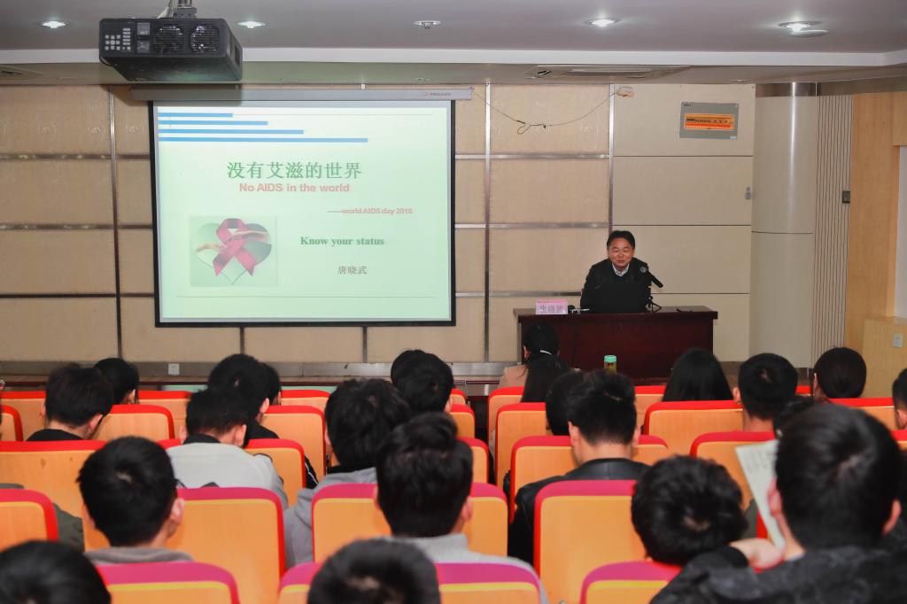 唐晓武以“没有艾滋的世界”为题,用通俗易懂的语言向学生详细讲解了艾滋病的背景知识、艾滋病的传播途径、艾滋病的预防等,在让大家了解目前艾滋病形势依然严峻的同时,告诫大家要主动检测,科学防治,生活中要自尊自爱,远离恶习。并引导学生树立科学正确对待艾滋病、尊重和关爱艾滋病患者、担负起预防艾滋病宣传教育责任的积极态度。