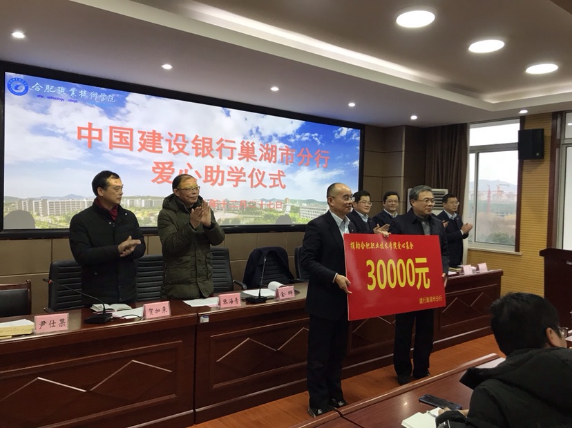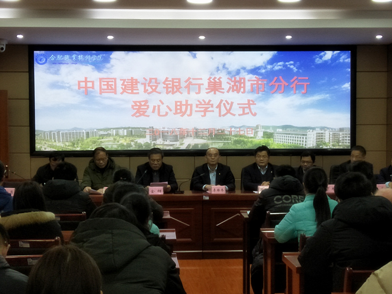12月27日下午,中国建设银行巢湖市分行爱心助学捐助仪式在我校鼓山校区五楼会议室举行。校纪委书记、关工委主任金辉,建行巢湖市分行副行长李雄伟、纪委书记周臣宝出席仪式。建行巢湖市分行相关部门负责人、校关工委部分委员、各学院资助工作专职辅导员和20名受助学生参加了仪式。仪式由学生处副处长、关工委秘书长尹仕果主持。