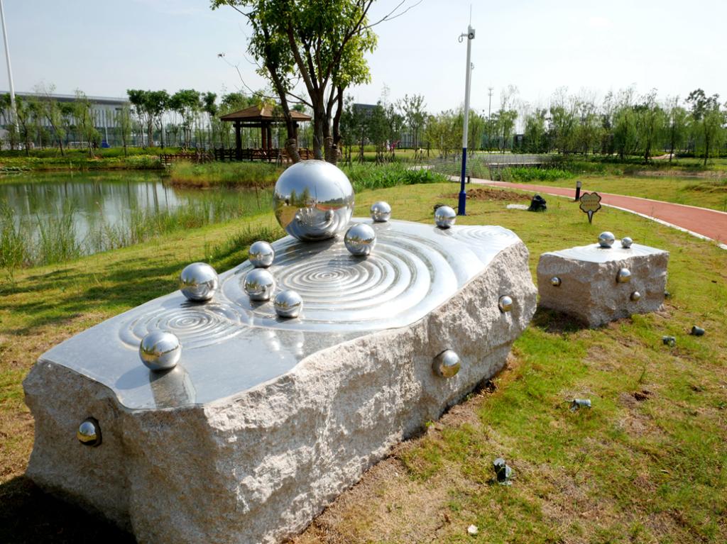 作品将不锈钢锻造成波澜的水面与石头巧妙结合,点点飞珠水溅,寓意知识的积累犹如雨滴汇聚成河,汇入大海。暗示学子兼收并蓄、博观约取,厚积薄发、挂帆沧海。作品长2.6米,材质为不锈钢锻造,花岗岩自然面。