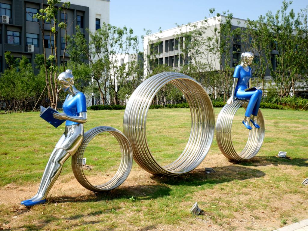 “读书不觉春已深,一寸光阴一寸金”,草坪上的休闲座椅与读者雕塑有机结合,引导学子勤学、善学、爱学、乐学,鼓励学子们在知识的时空中不断探索、快乐学习。作品高2.3米(最高点),材质为不锈钢锻造,表面着色。