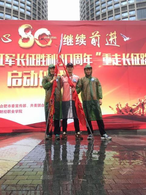 我院师生冒着大雨,举着团旗、校旗,一路上唱着长征歌曲,说着长征故事,相互鼓励,相互扶持,在党委胡其云书记的全程陪同下,最终全部到达终点,获得比赛的季军。值得一提的是,我院张维一、李绪玉、李忠锋、王康4名同学仅用了2个半小时就到达了终点,成为第一批到达的人员。