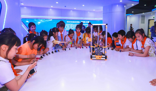 在志愿者的引领下,青岗小学的师生走进3D打印体验馆,深切感受3D打印的魅力。在桌面级3D打印机前,小学生们仔细观察机器的工作原理,看到原本简单的材料“变身”形状各异的艺术品,小学生们直呼神奇。