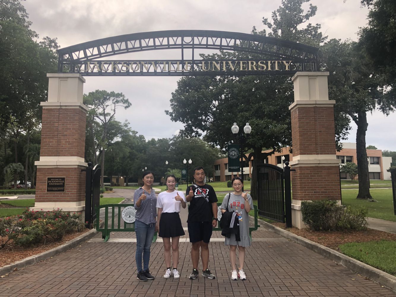 耿璐老师与我校三名学生在杰克逊维尔大学门前留影