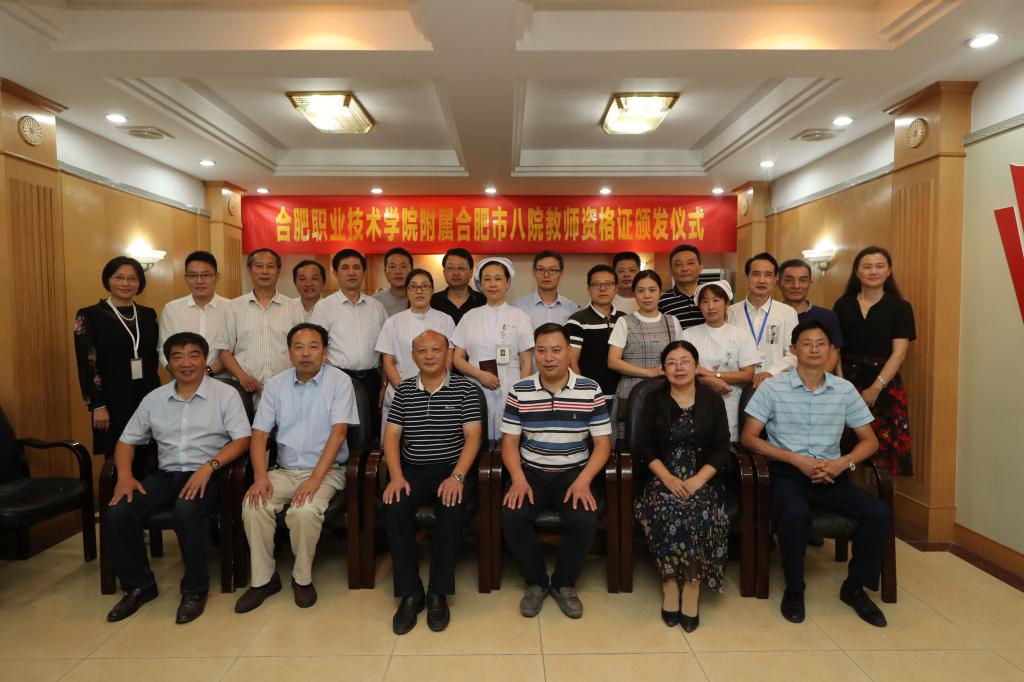 颁证仪式上,唐智国代表合肥市第八人民医院对首批取得教师资格证的24位医师表示祝贺,祝贺各位医师又取得了一个新的资格证书,从此具有了“医师”和“教师”双师资格;对合肥888集团学院在教师岗前培训及资格认定工作中给予的帮助和支持表示感谢,希望各位新老师在职业生涯中无论作为医师还是教师要有医德和师德,要爱岗敬业,教书育人做一名合格的医师和老师。