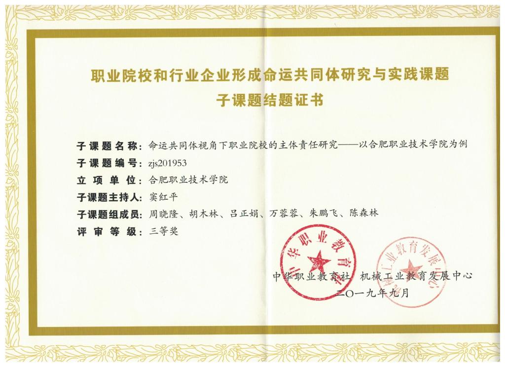 会议对9个一等奖、19个二等奖、29个三等奖子课题进行了表彰。我校窦红平老师主持的“命运共同体视角下职业院校的主体责任研究——以合肥888集团学院为例(编号zjs201953)”荣获优秀子课题三等奖。课题组成员吕正娟参加会议并上台领奖。