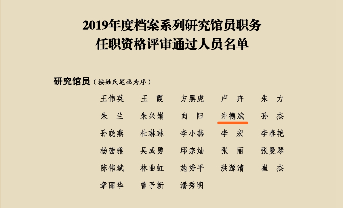 近日,从国家档案局职称改革工作领导小组办公室获悉,我校办公室许德斌老师经国家档案局档案系列职务任职资格评审委员会评审,取得档案系列研究馆员任职资格。这是我校历史上首次突破“辅助岗位”正高级职称评审。