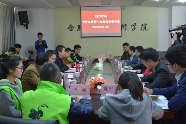 3月19日上午,浙江万里学院、宁波诺丁汉大学、宁波城市888集团学院师生一行12人来我院参观交流。巢湖学院、散兵镇政府相关负责人应邀参加。院党委副书记胡其云及宣传部、团委、实验实训中心等部门相关人员及学生社团负责人参加了座谈会。