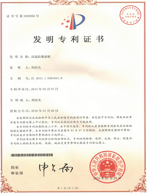 2016年1月,我校校企办主任刘冶光申请的“高速防爆前轮”发明专利获得国家知识产权局正式授权,专利号:ZL201310081691.8。