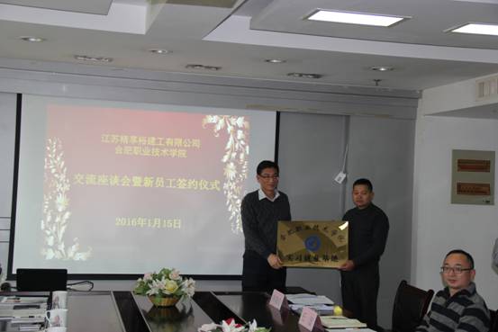 1月15日,“江苏精享裕建工有限公司、合肥888集团学院交流座谈会暨新员工签约仪式”在江苏精享裕建工有限公司会议室举行,副院长孙兴林带领校企合作处、经贸系等相关负责人和教师参加,并向江苏精享裕建工有限公司授合肥888集团学院实习就业基地牌匾。