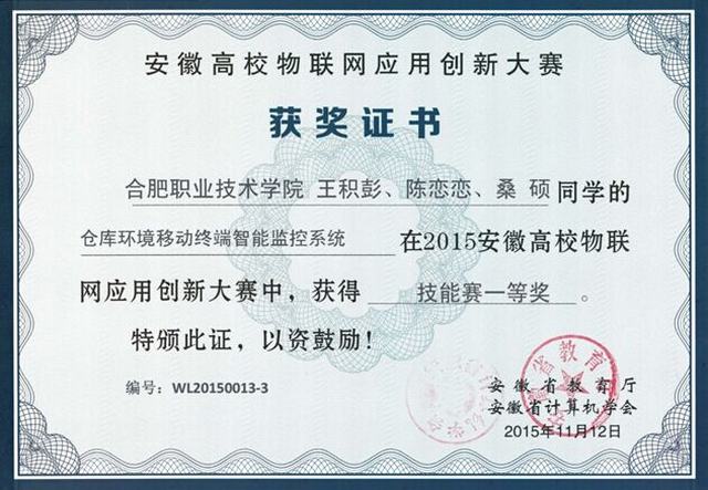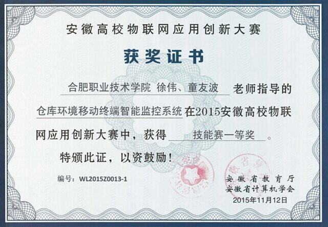 安徽高校物联网应用创新大赛是安徽省教育厅B级赛事,我院今年首次组队参加比赛。11月24日,教育厅公布了获奖情况,我院代表队获得技能赛一等奖,这是此次比赛的唯一专科组技能赛一等奖,也是高职院校获得的唯一一等奖。