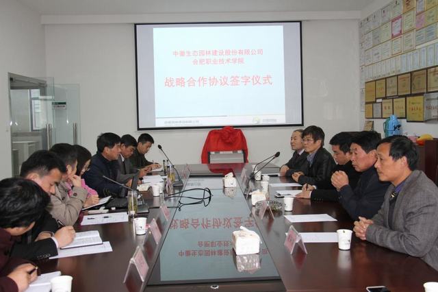 2015年11月21日早上9:00,在中徽生态园林建设股份有限公司总部,中徽园林公司董事长黄明华率公司总裁助理、行政总监、终云端信息网络执行运营总监、设计部部长、人力资源部副部长,以及合肥关工委驻中徽园林耿峰主任等,热烈欢迎学校党委胡其云副书记率领的生物系、计算机系、实验实训中心(校企合作处)等相关部门负责人和老师的到来,并举行了战略合作协议签字暨实践教学基地揭牌仪式。仪式由合肥市关工委驻中徽园林的耿峰主任主持。