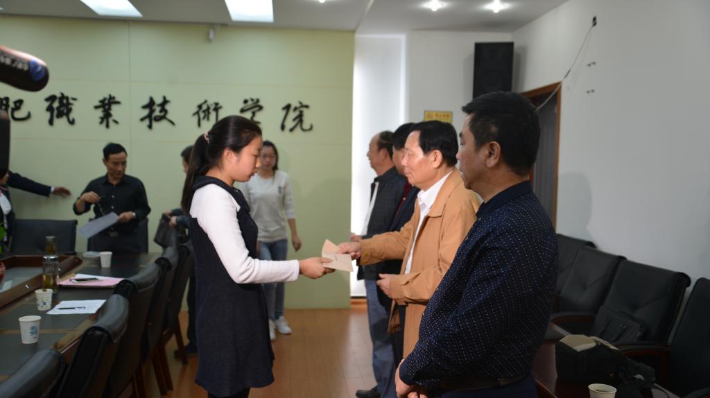 捐助仪式由学院关工委常务副主任杨劲松主持。首先,受捐助的15名家庭经济困难学生分别简要汇报了本人的学习及家庭经济情况,表达了对中徽园林建设有限公司及黄明华董事长的感激之情。合肥市关工委巢湖工作处的胡远林主任向受捐助的同学、与会老师介绍了中徽园林建设有限公司及黄明华董事长多年来的爱心和善举,对中徽公司及黄董事长表示了感谢,对我院的关心下一代工作给予了肯定,希望同学们懂得感恩、励志奋发,做全面发展的“四有”新人。