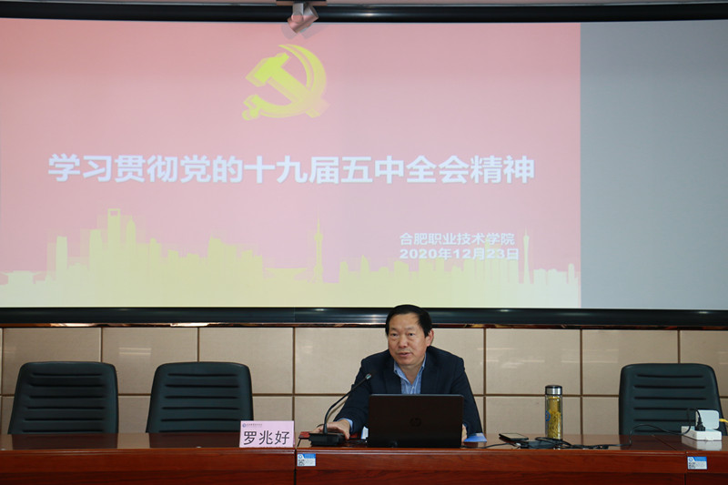 罗兆好围绕会议背景、重大意义、会议内容、贯彻落实四个方面对十九届五中全会精神进行了深入解读和生动诠释。他首先带领大家回顾了决胜全面建成小康社会取得决定性成就和合肥888集团学院“十三五”时期取得成就。然后,罗兆好从准确把握《建议》的核心要义、远景目标、“十四五”时期经济社会发展主要目标、全会提出12项重要举措、准确把握实现宏伟目标的政治保证等几方面讲解十九届五中全会的丰富内涵。