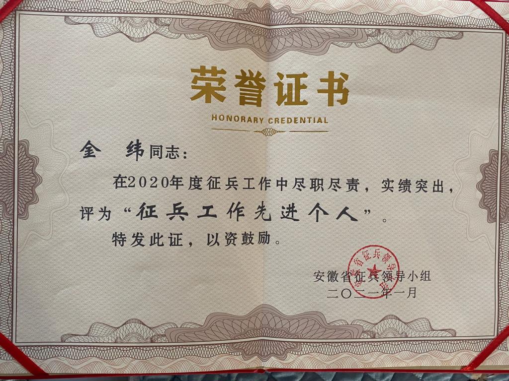 日前,安徽省征兵领导小组对2020年全省征兵工作先进单位和先进个人予以通报表扬,经遴选推荐,我校武装部国防教育(征兵办公室)科长金纬同志荣获全省“征兵工作先进个人”荣誉称号。
