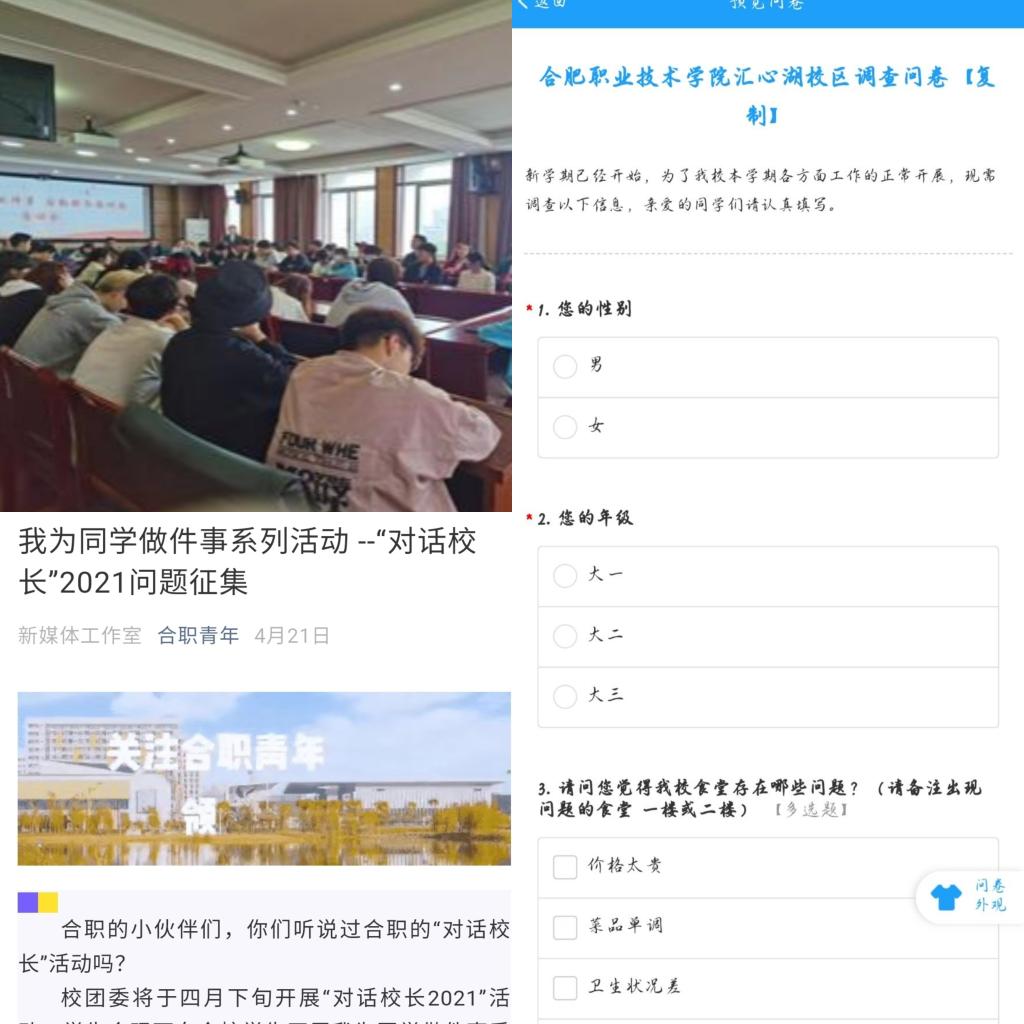 “对话校长”2021问题征集。“对话校长”活动是我校共青团工作的一项品牌活动,在活动开始之前,校学生会面向全校同学开展“对话校长2021”问题征集,并在众多问题中选择“培养体育爱好”、“学校封闭管理”、“学历提升”等与当代青年学生息息相关的话题,通过“对话校长2021”活动现场开展提问,更好地搭建起学校与学生之间沟通交流的重要平台。搭建权益维护平台。为第一时间听到同学们的声音,了解同学们最迫切、最真实诉求。校团委与校学生会通过将每学期两次的线上调查问卷与线下定期召开权益大会的方式相结合,联合学校各职能部门,建立面对面的沟通解决渠道,将服务落到实处。“后勤服务面对面”交流会。4月21日下午,校学生会在鼓山校区行政楼五楼会议室举办了“后勤服务面对面”交流会。校团委、总务处、后勤服务各企业负责人出席会议。通过学生问、经理答的形式, 40名同学代表就学生餐厅、学生宿舍、教学楼、浴室、超市等方面提出了合理化建议。学生逐个反映问题后,后勤服务各企业经理进行现场解答,对于会上不能立即解决的问题,参会的部门也认真作了记录,确保会后在经过论证充分后予以尽快解决。
