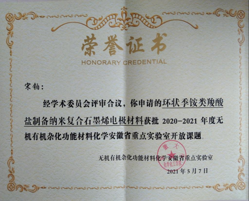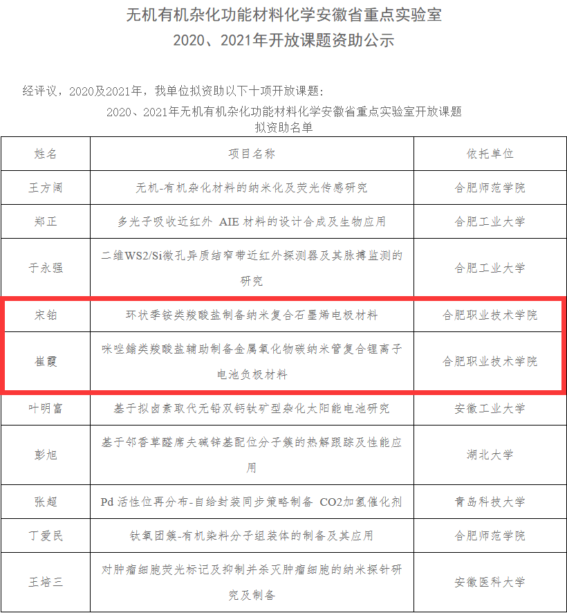 近日,据安徽省重点实验室通知,我校博士后研究中心团队崔霞、宋铂两位老师申请的无机有机杂化功能材料化学安徽省重点实验室开放课题已获批,并获得立项资助,资助经费为4万元,课题将在2021年5月至2023年4月期间执行。我校是本次立项开放课题唯一入围的职业院校。