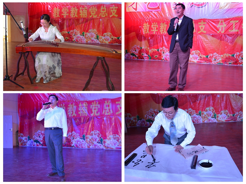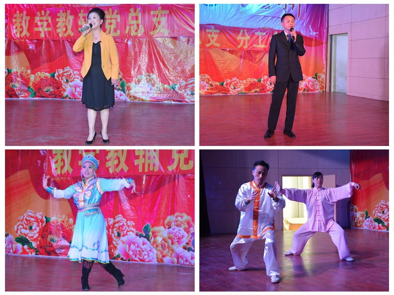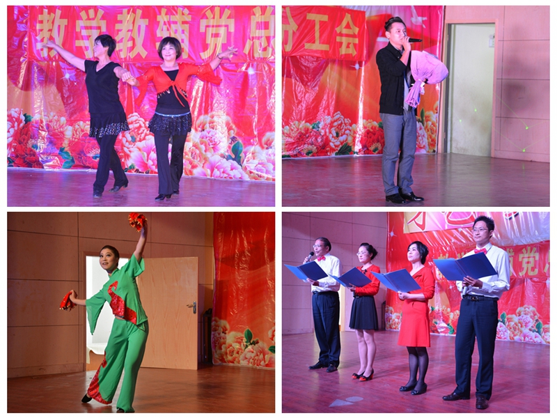 为了丰富教职工业余生活,营造良好的校园文化氛围,教学教辅党总支三个支部通过精心准备,于10月15日下午在学院大学生活动中心举办了一场别开生面的才艺展示,院领导丁家康、方志斌、茆书斌、胡其云、金辉、张广龙和相关部门负责人出席并兴致盎然地参加了演出。他们的到来给教学教辅党总支全体教职工增加了信心,大家和院领导欢聚一堂,独唱、大合唱、诗朗诵、舞蹈、书法、太极拳、口哨和乐器表演等精彩纷呈。其中教学教辅总支第三支部刘靓老师的独舞《山丹丹花开红艳艳》以其欢快的旋律和优美的舞姿获一等奖,院领导登台演出更是让现场高潮迭起,胡其云副书记首先为师生们演唱了一首拿手的歌曲《高原红》,方志斌院长、张广龙主席和教学教辅第二支部王少俊老师一起上场的“中国书法”大气恢弘,丁家康书记一首饱含深情的《一剪梅》、茆书斌副院长的电子琴独奏《驼铃》等让现场掌声不断,整台节目在全场一起参与的大合唱《歌唱祖国》的歌声中拉下帷幕。