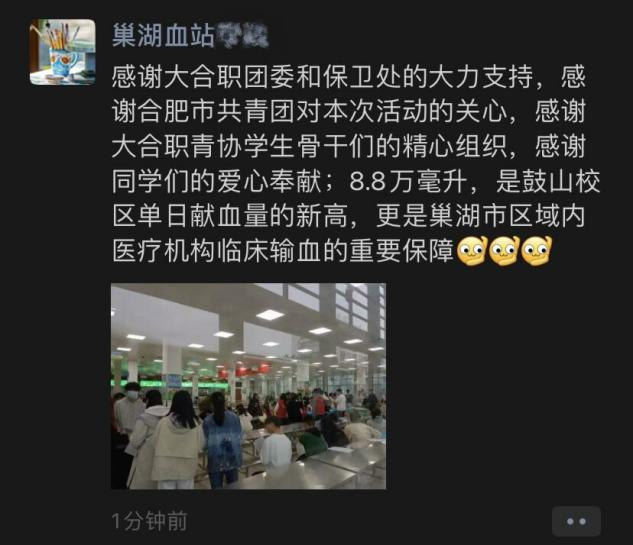 为缓解季节性缺血局面,保障巢湖的用血需求,10月16日,我校联合巢湖市献血站在鼓山校区一食堂一楼举办了“爱心献血 为生命加油”献血活动,掀起了一场无偿献血的爱心热潮。此次爱心献血活动吸引了广大师生的踊跃参与,共计有820多人次参加献血,自愿为社会奉献一份爱心。