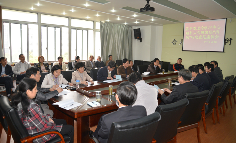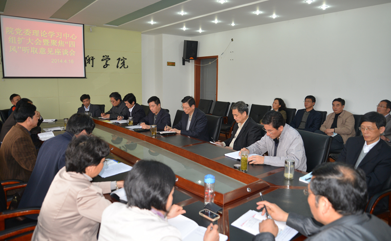 4月16日下午,院党委在行政楼三楼会议室召开中心组理论学习扩大会暨聚焦“四风”听取意见座谈会,会议由院党委书记丁家康主持,院党委理论中心组成员及各党总支书记,各处室、系部(分院)及直属机构主要负责人参加了学习。
