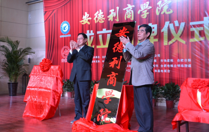 4月11日上午,我院与安徽安德利百货股份有限公司联合举办的安德利商学院在大学生活动中心举行了成立揭牌仪式。出席仪式的领导和嘉宾有原巢湖市政协主席张传才,原巢湖市人大党组书记、主任曹德钧,合肥市行政学院院长张小樵,巢湖市副市长郑连胜,巢湖市人力资源和社会保障局党组书记钱扬政,巢湖市商务局副局长陈昌琴,庐江县商务局副局长陈述,中国科学技术大学管理学院博士生导师、安徽安德利百货股份有限公司独立董事丁栋虹,首都经济贸易大学工商管理学院教授、安徽安德利百货股份有限公司顾问陈立平,国行课程“全赢人生”创始人、安徽安德利百货股份有限公司顾问谷跃东,北京影响力企业管理有限公司董事副总裁文海炜,安徽安德利百货股份有限公司董事长陈学高,院党委书记丁家康,院长方志斌。