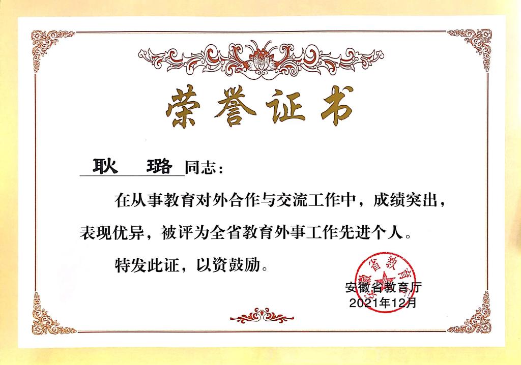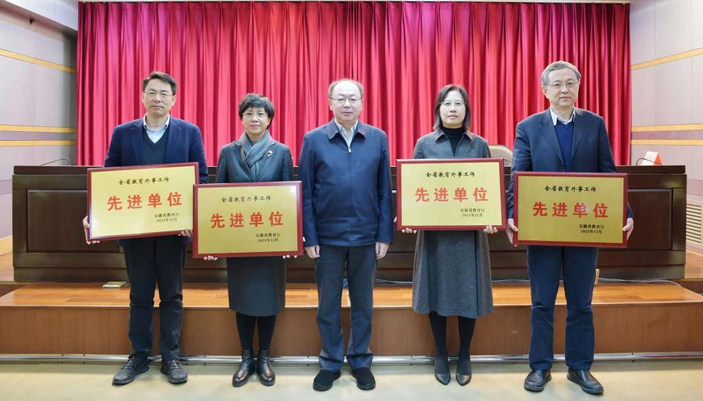 本次会议是我省召开的首次教育外事工作会议,会议深入贯彻教育部全国外事工作会议精神和安徽省第十一次党代会精神,总结工作,交流经验,全面部署我省当前和今后一个时期加快和扩大新时代全省教育对外开放工作。会上通报表扬了全省教育外事工作先进单位和先进个人,我校荣获“全省教育外事工作先进单位”荣誉称号,外事办耿璐同志获“全省教育外事工作先进个人”称号。
