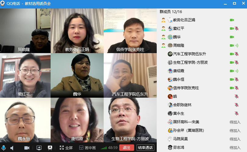 1月5日,我校召开2021-2022学年第二学期教材选用评审会,会议采用视频方式进行。教材选用工作委员会主任、副校长周晓隆教授,教材选用工作委会副主任魏华、窦红平,唐绍霞、张克柱、方丽波、伍东升、陈继林、魏永恒、吴昊、徐皓、黄永生等委员及吕正娟秘书参加视频会议,宋美委员以书面形式反馈评审意见。评审会由教务处副处长(主持工作)窦红平主持。
