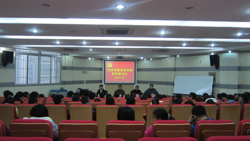 12月10下午,经贸系党总支在图书馆学术报告厅召开预备党员发展组织谈话会,学院党委副书记胡其云出席会议并讲话。组织部和经贸系党总支负责人、学生支部成员、2013年发展的100名预备党员参加会议。会议由经贸系党总支书记王秀珍主持。