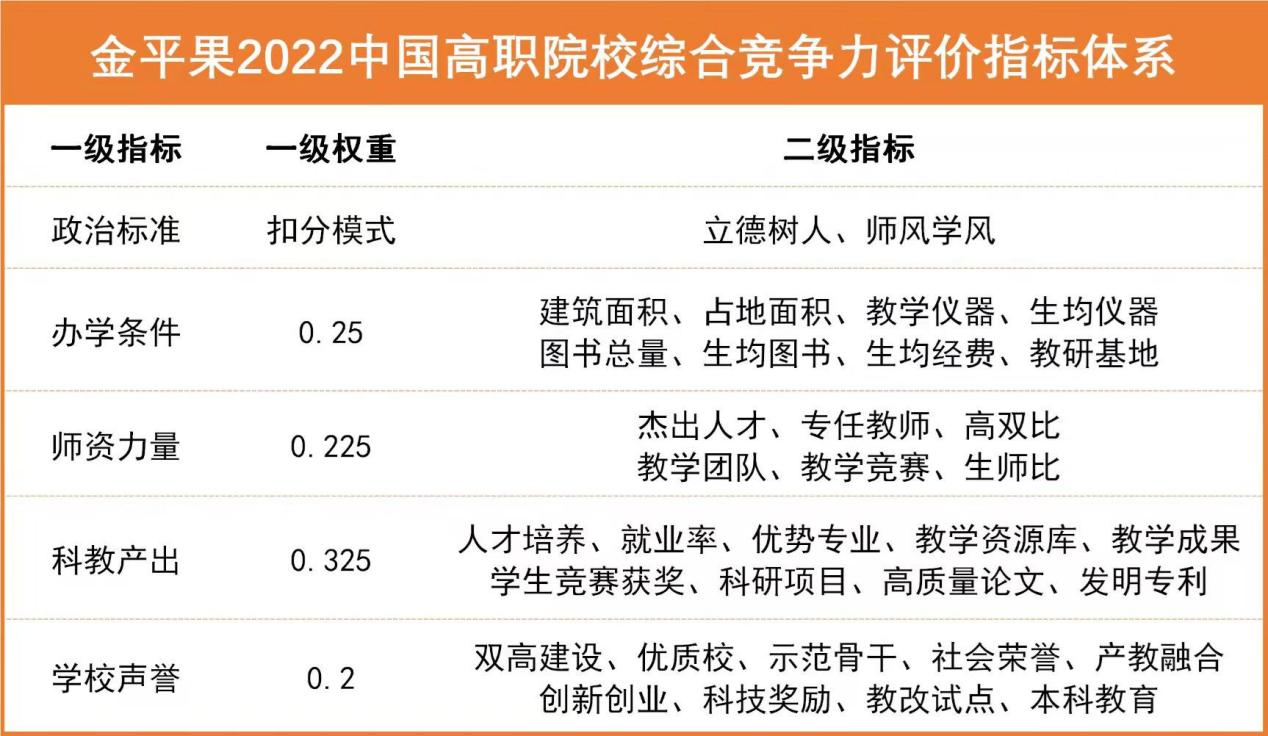 3月16日,中国科教评价网发布2022年“金平果”中国高职院校竞争力排行榜1000,该排行榜主要评价指标体系包括政治标准、办学条件、师资力量、科教产出、学校声誉等5个一级指标以及34个二级指标。据悉本次发布是中国科教评价网连续第十一次发布此类信息,其中我校2020-2022年各项竞争力排名稳步提升。