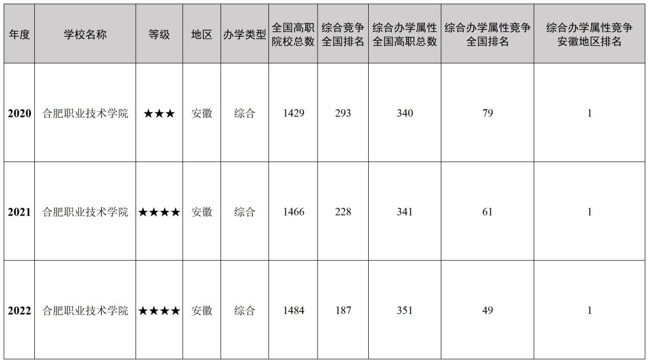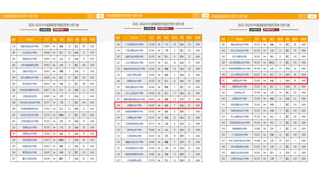 综合分析我校2020-2022年各项数据,在全国高职院校总数连年增加的趋势下,我校在全国高职院校排名及安徽省地区排名中均稳步提升,其中2022年在全国高职高专院校中排名升至第187名;在全国“综合办学属性”高职高专院校中,我校在全国排名稳步提升,其中2022年在全国“综合办学属性”高职高专院校中排名升至第49名,连续三年综合办学属性竞争安徽地区排名第一。