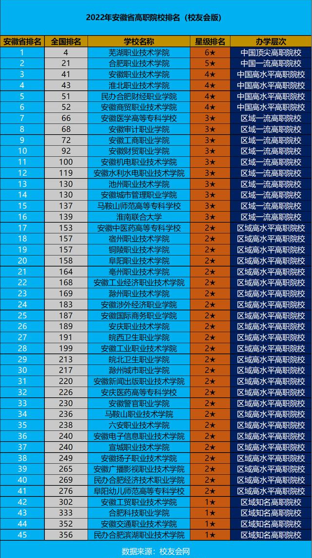 根据中国校友会网(艾瑞深中国校友会网 )最新发布的2022中国大学排行榜,2022年度的大学排名中安徽省共有45所高职院校进入排名!和去年相比,入榜高校数量保持一致。