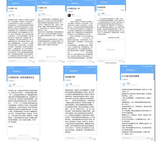 本次劳动教育宣传周期间,各学院通过召开主题班会,组织广大同学学习习近平总书记关于劳模精神、劳动精神、工匠精神等重要论述;学习先进典型人物事迹;观看劳动教育纪录片;开展劳动教育主题征文等方式,充分提高学生的思想认识,深刻理解劳动教育的时代内涵与重要意义。