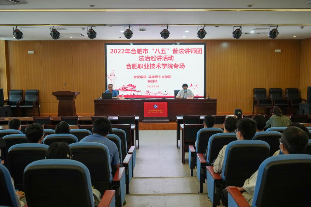 为全面贯彻和落实习近平法治思想,适应新时代中国特色社会主义法治对一流人才的新要求,全面提升学校人才培养质量,切实做到习近平法治思想“进教材、进课堂、进头脑”。5月26日,学校邀请了合肥学院马克思主义学院教师、合肥市“八五”普法讲师团成员郭剑峰在汇心湖校区就习近平法治思想进行专题讲座。