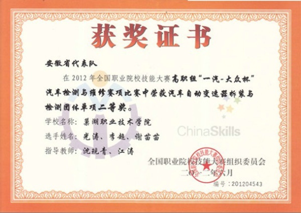 一是学院紧贴行业企业办学,人才培养质量不断提高,学生在各项技能大赛中频频获奖。2008年以来,我院积极组队参加安徽省高职院校学生职业技能大赛,每年均取得可喜成绩。据统计,共11人次获得省高职学生职业技能大赛二等奖,14人次获得三等奖;2012年在全国高职院校技能大赛中,我院荣获汽车检测与维修项目团体比赛三等奖、汽车自动变速器拆装与检测单项比赛二等奖的优异成绩;成绩的取得,充分展现了我院学生较强的专业技能和努力进取、刻苦钻研的精神风貌,也是我院全力以赴抓质量,校企合作有成效的有力验证。