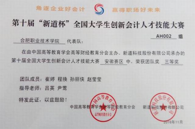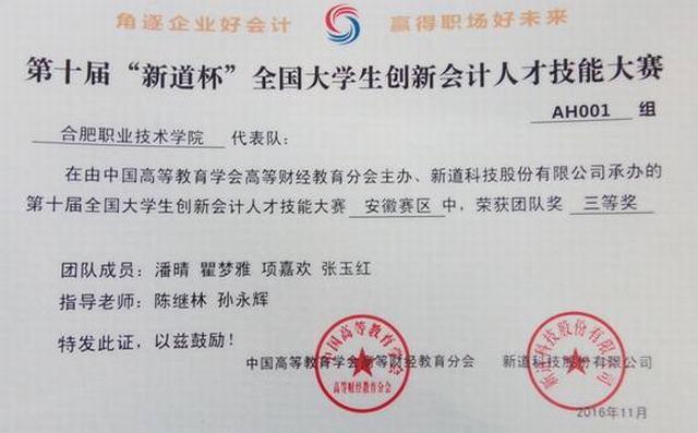 2016年11月20日,第十届“新道杯”全国大学生创新会计人才技能大赛暨寻找“企业好会计挑战赛”全国联赛(安徽赛区)在安徽财贸888集团学院举办。由我院经贸系会计教研室陈继林、孙永辉、吕英和尹莺等四位老师指导的两组代表团队双双荣获“三等奖”。