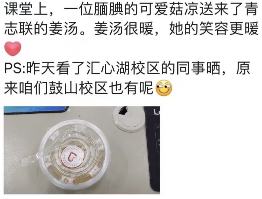 为了感谢老师和后勤工作人员一年以来的辛劳付出,青年志愿者联合会在大雪节气前后(12月7日和8日)分别于汇心湖和鼓山校区开展暖心活动,为我们的老师和后勤工作人员献上姜汤和亲手编织的围脖。