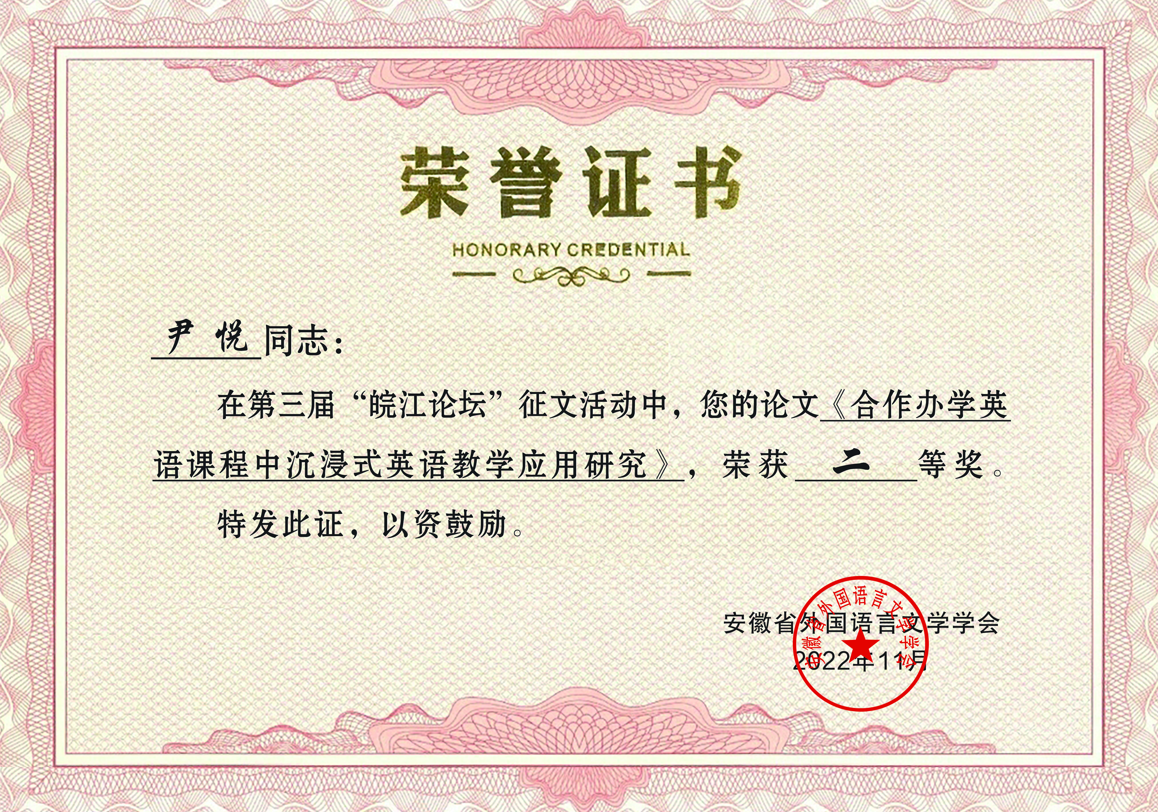 会后,安徽省外文学会秘书长曹军教授宣读了第三届皖江论坛征文获奖结果。本次论坛分翻译、语言学与跨文化、文学、高职、教学五个组别,共收到征文稿件157篇。这也是安徽省外文学会年会首设高职高专分论坛和论文单独评审。基础教育学院高度重视此次征文比赛,积极动员教师投稿。经专家匿名评审,奚雅云老师的《思政教育背景下的教师课堂话语研究——以中外合作办学英语类课程为例》和尹悦老师的《合作办学英语课程中沉浸式英语教学应用研究》两篇论文分获高职高专组一等奖和二等奖。