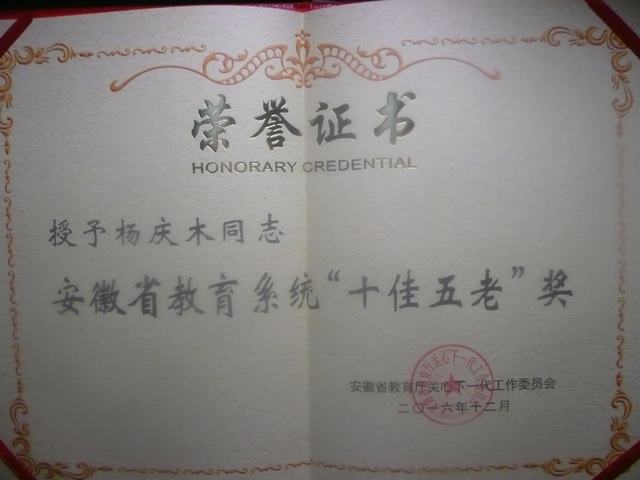为大力弘扬“五老精神”,不断激励关工委工作发展,遵照安徽省关工委部署,省教育厅关工委决定连续五年(2016—2020)在全省教育系统开展争创全省及全省教育系统“十佳五老”、“十佳关工委”活动。2016年是首次开展评选教育系统“十佳五老”、“十佳关工委”活动,我校关工委主任杨庆木同志因退休后8年投身关心下一代工作,汇聚人心与力量,形成了全校“关心与支持”的工作格局,促进了学校关工委工作不断发展而获此殊荣。3月8日,在省委教育工委召开的2017年全省教育系统关心下一代工作会议上,省教育厅关工委向2016年双首届“十佳”的单位和个人进行了颁奖,杨庆木主任在主会场领取了荣誉证书。(供稿:关工委 编辑:朱鹏飞)