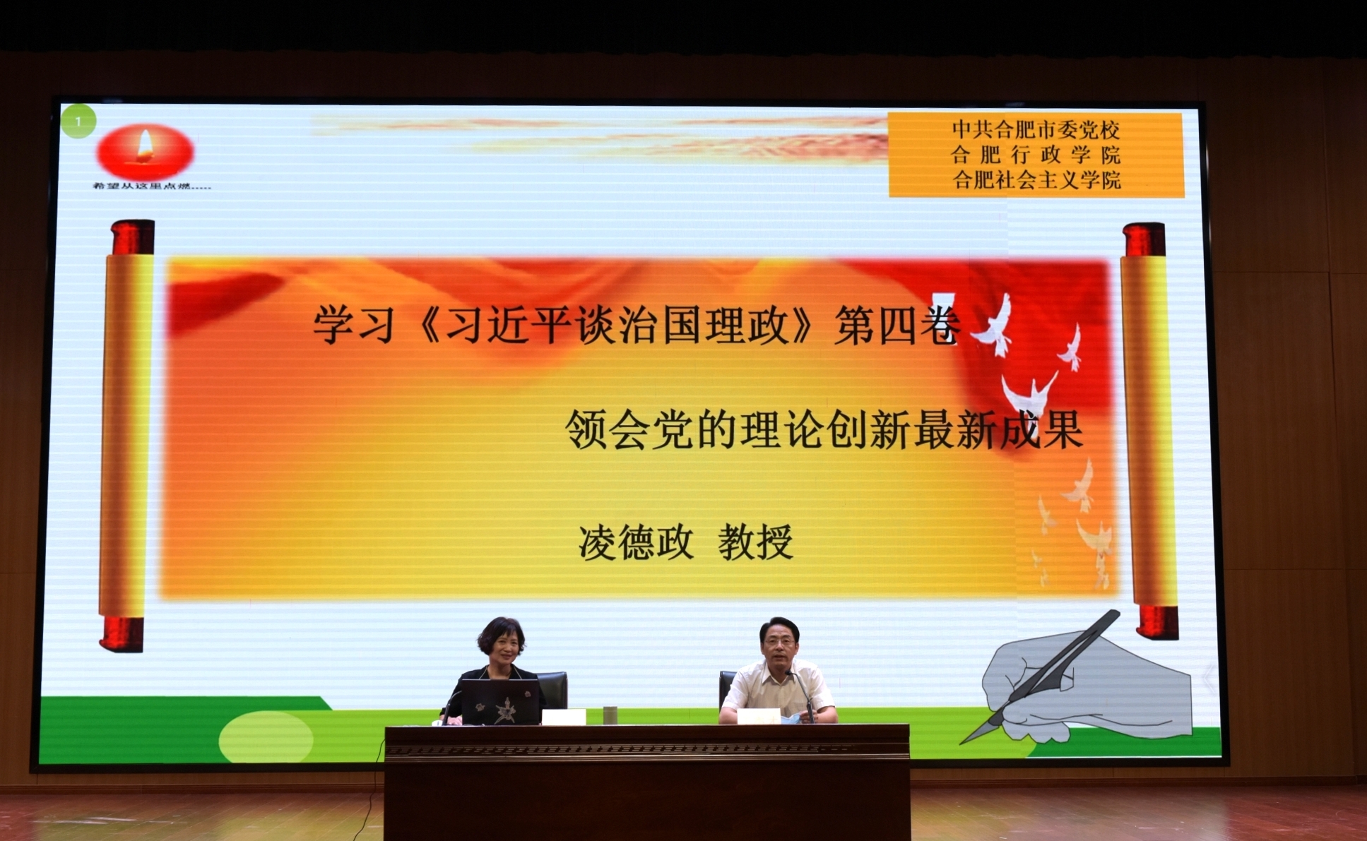 为深入学习《习近平谈治国理政》第四卷,系统领悟习近平新时代中国特色社会主义思想,迎接党的二十大胜利召开,9月21日下午,我校举办了《习近平谈治国理政》第四卷专题宣讲报告会暨党委理论学习中心组学习会,会议由党委书记王杰才主持,邀请了合肥市委党校党史党建教研部凌德政主任担任主讲人,校领导班子成员、全体副科级以上干部、马克思主义学院全体教师、学生入党积极分子代表参加学习会。