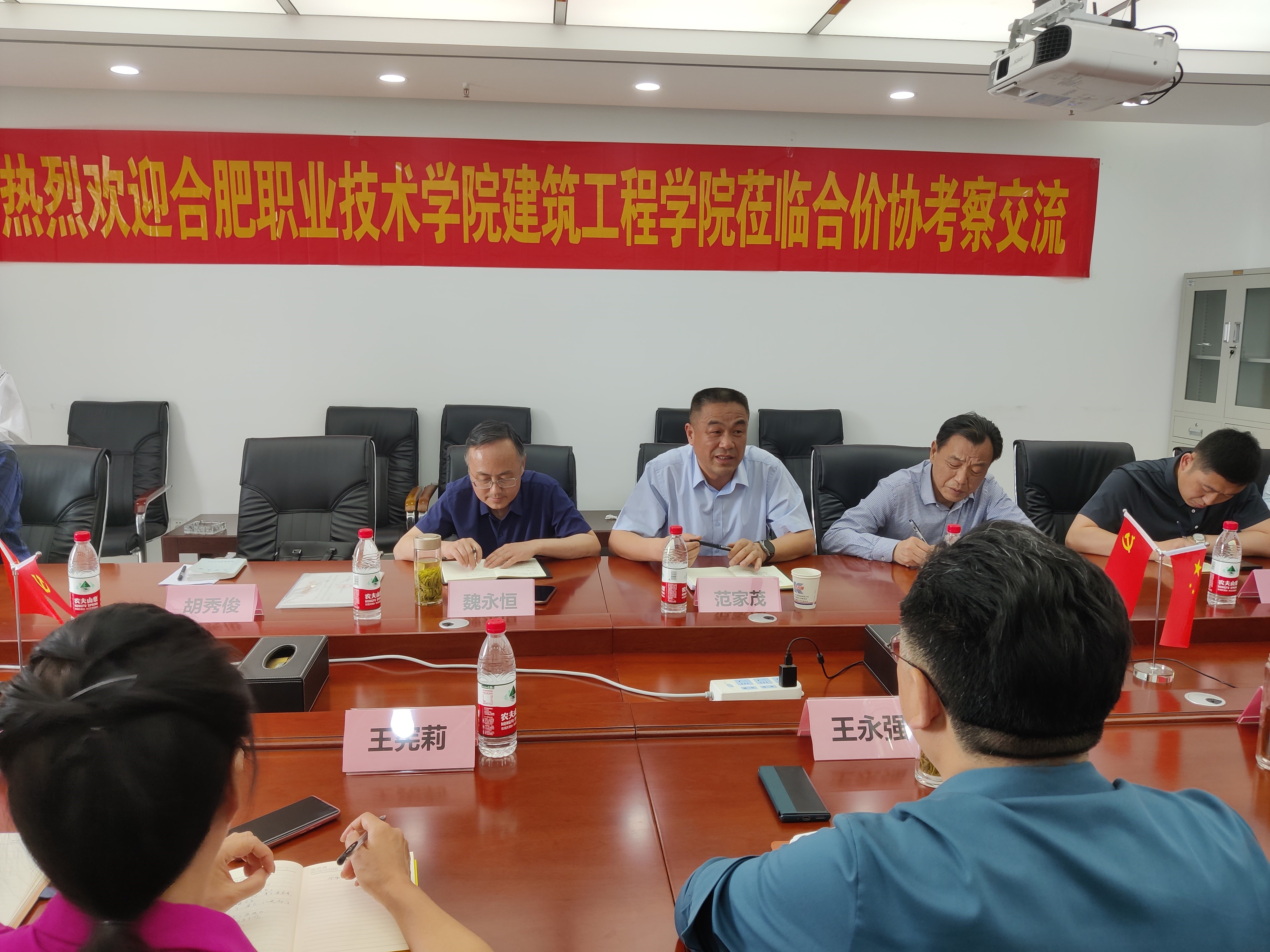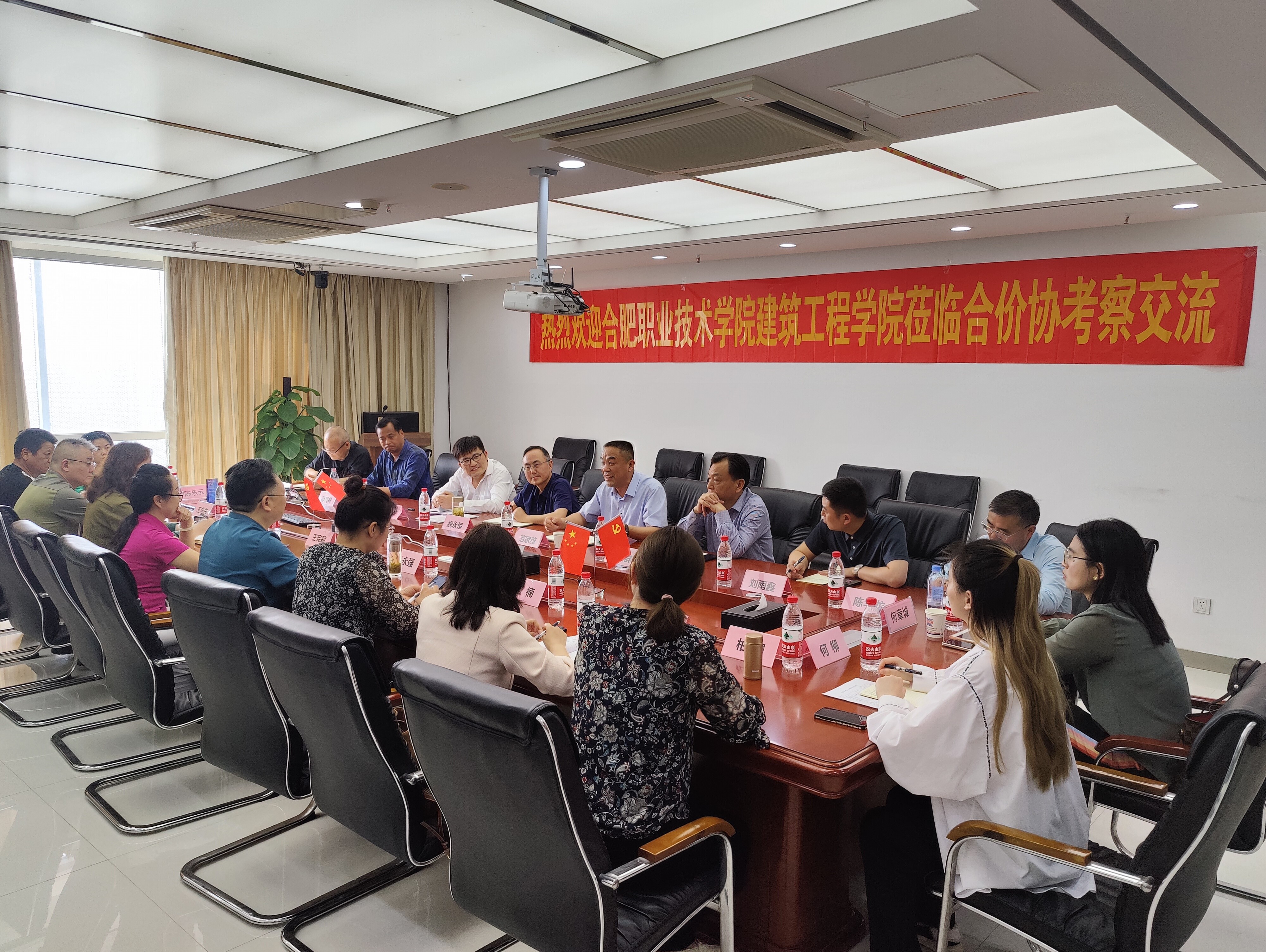 王永强首先对我校一行人员表示热烈欢迎,随后简要介绍了合肥市建设工程造价协会有关发展情况,对在我校建筑实训工厂举办的“合肥市建设工程造价协会企业技术人员实地学习提高培训班”给予高度评价,并希望进一步加强校企合作。范家茂对企业的热情接待表示感谢,介绍了我校的人才培养、社会培训等情况,重点就建筑工程学院首届“工程造价本科班”培养情况、未来就业向企业进行推荐,争取企业就业支持。范家茂表示将持续做好企业服务,邀请企业专家到校开展学术讲座,加强校企协同育人,并希望在多元化企业培训、横向课题研究、职称申报等方面加强合作。与会的其他同志就人才培养、职称申报培训、职工岗前培训等开展了广泛而深入的交流。