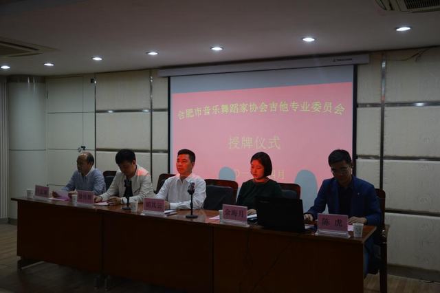 2017年4月25日下午,在我院图书馆第二报告厅举行合肥市音乐舞蹈家协会吉他委员会授牌仪式。我院党委副书记胡其云,院团委书记佘海月,合肥市音协吉他专委会会长徐传辉、副会长盛玉长、陈虎、汪宏斌以及我院各社团热爱音乐的一百多名学生参加了此次授牌仪式。