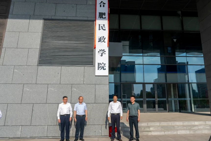 签约仪式后,高光权,王杰才,徐生彬,市教育局党委委员、副局长张艺国共同为“合肥民政学院”揭牌。未来,市民政局与我校将携手借助合肥民政学院这一平台,在民政专业人才,特别是职业技能人才培养方面精诚合作,深化新模式、探索新路径、总结新经验,开创人才辈出,人尽其才的崭新局面。依托协议,双方将围绕专业教育、就业见习、在职教育、培训竞赛等领域,共建服务平台,优化服务方法,转化服务成果。着力打造“四个服务平台”,即合肥民政学院大学生培养基地,合肥民政学院毕业生实习基地,合肥民政学院在职教育培训中心,合肥民政学院职业技能竞赛中心,实现校地优势互补、资源共享、平台共建和互惠共赢。
