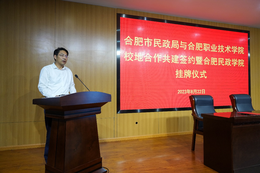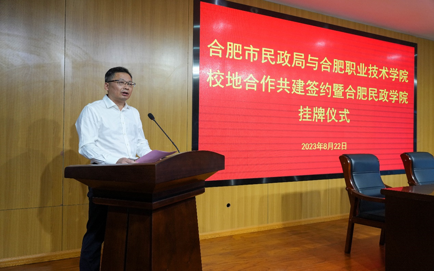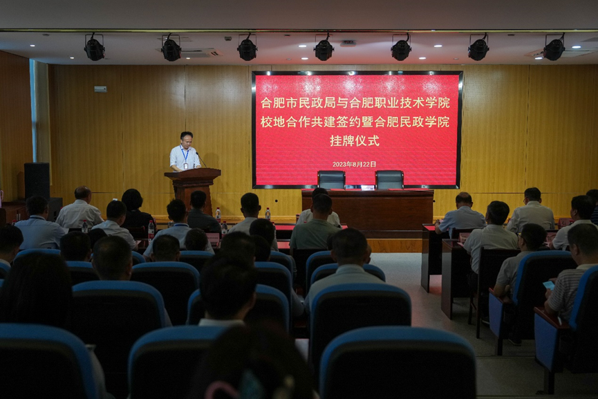 8月22日下午,我校与合肥市民政局校地合作共建签约暨“合肥民政学院”挂牌仪式在汇心湖校区举行。省民政厅党组成员、副厅长高光权,我校党委书记王杰才,校党委副书记、校长檀明,市民政局党组书记、局长徐生彬出席仪式并致辞。省民政厅、市民政局、市教育局相关领导,市民政局机关各处室、局属单位负责人、各县(市)区民政局、开发区民政机构负责人;我校党委副书记金飞燕,校党委委员、副校长周晓隆,相关职能部门、二级学院及专业负责人,部分专业教师共60余人参加活动。签约、挂牌仪式由檀明主持。