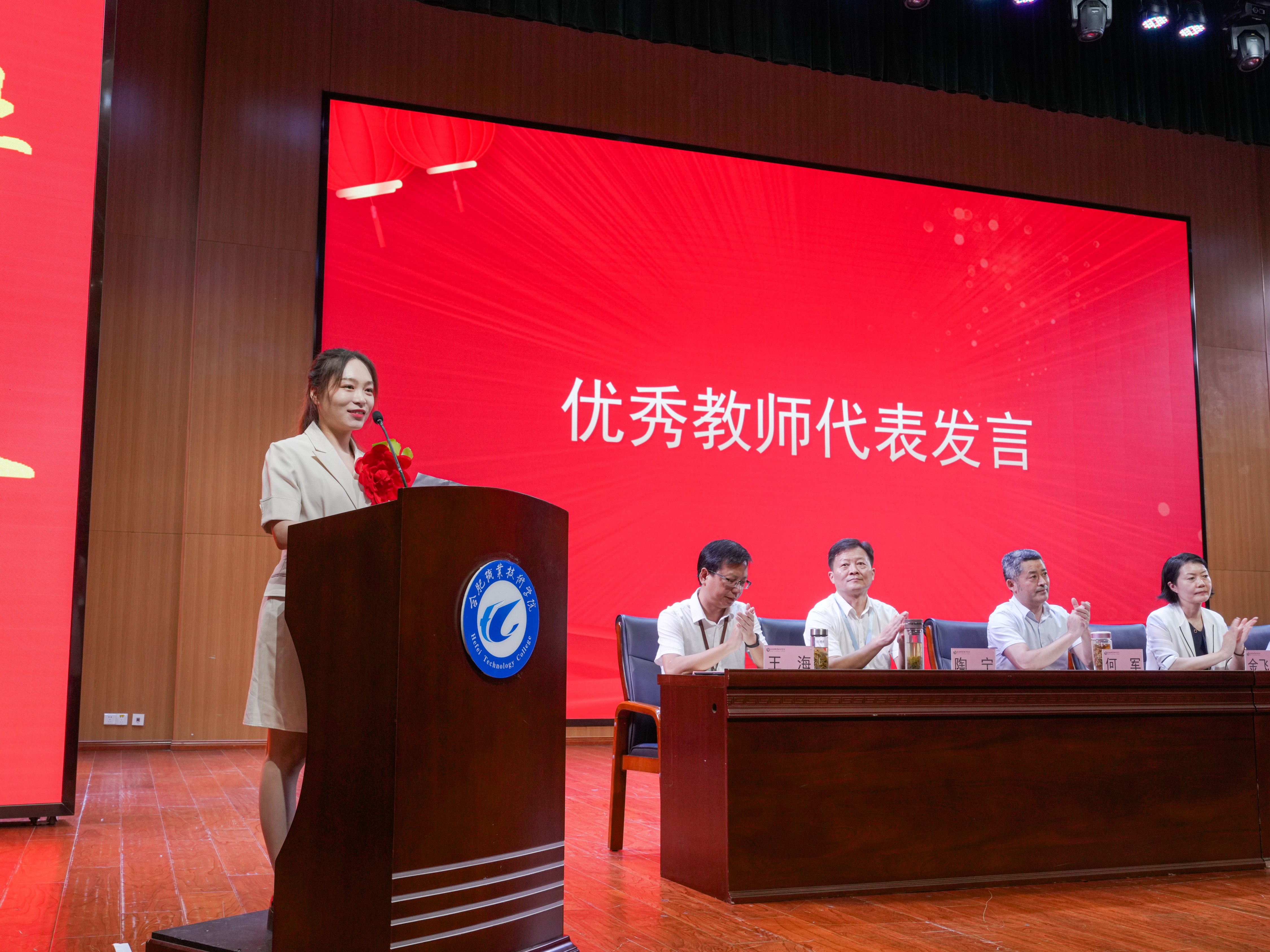 受表彰教师代表朱子琪、方鲁兵分别作了发言,分享自己在教育教学方面的感受、体会,畅谈对学校事业发展的憧憬、祝愿。