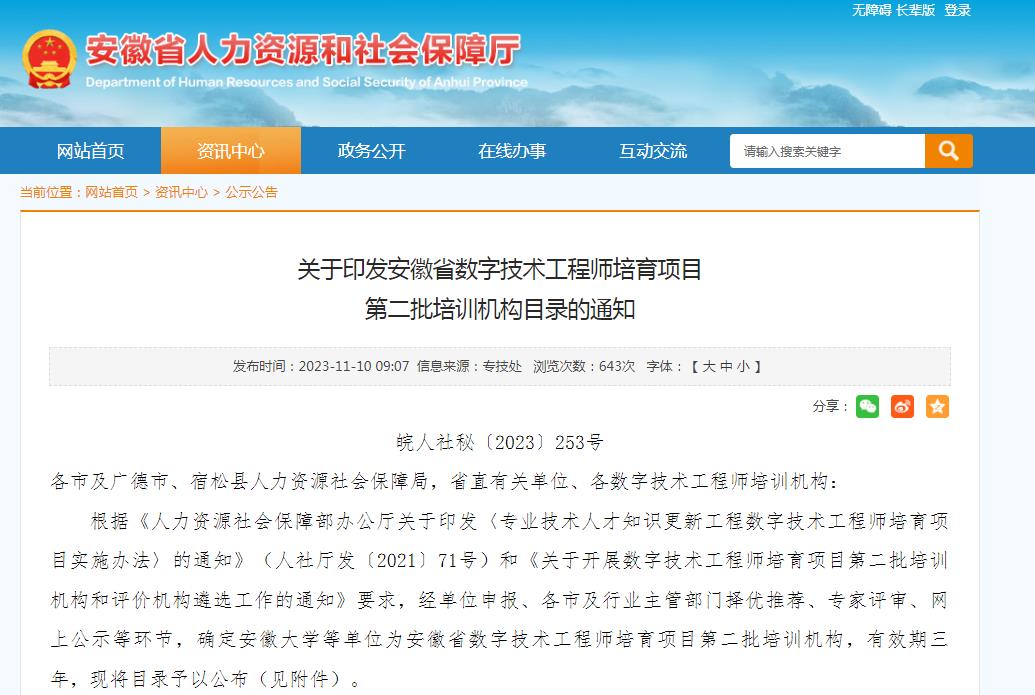 为贯彻落实党的二十大精神和习近平总书记关于做好新时代人才工作的重要思想,加快数字技术人才自主培养,根据《专业技术人才知识更新工程实施方案》和《数字技术工程师培育项目实施办法》,我校经自主申报、专家评议、人社部审核等程序,成功入选数字技术工程师培育项目第二批培训机构,获批成为“物联网工程技术人员”“虚拟现实工程技术人员”两个工种的培训机构。