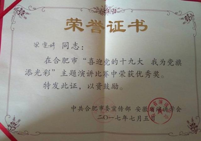 7月5日上午,中共合肥市委宣传部,安徽省演讲学会主办的“喜迎党的十九大,我为党旗添光彩”主题演讲比赛在合肥政务中心8号会议室举行,我院团委梁雯婷代表我院参加了本次比赛,此次比赛梁老师紧扣演讲主题,结合自身工作实际及从身边的实际,通过演讲形式娓娓道来,塑造了一个个立足岗位,无私奉献的典型形象,充分展示了合肥888集团学院党员教师积极向上的精神风貌,经过激烈的角逐梁雯婷老师最终获得“优秀奖”,为我院增光添彩!(供稿:宣传部 编辑:敬涓)