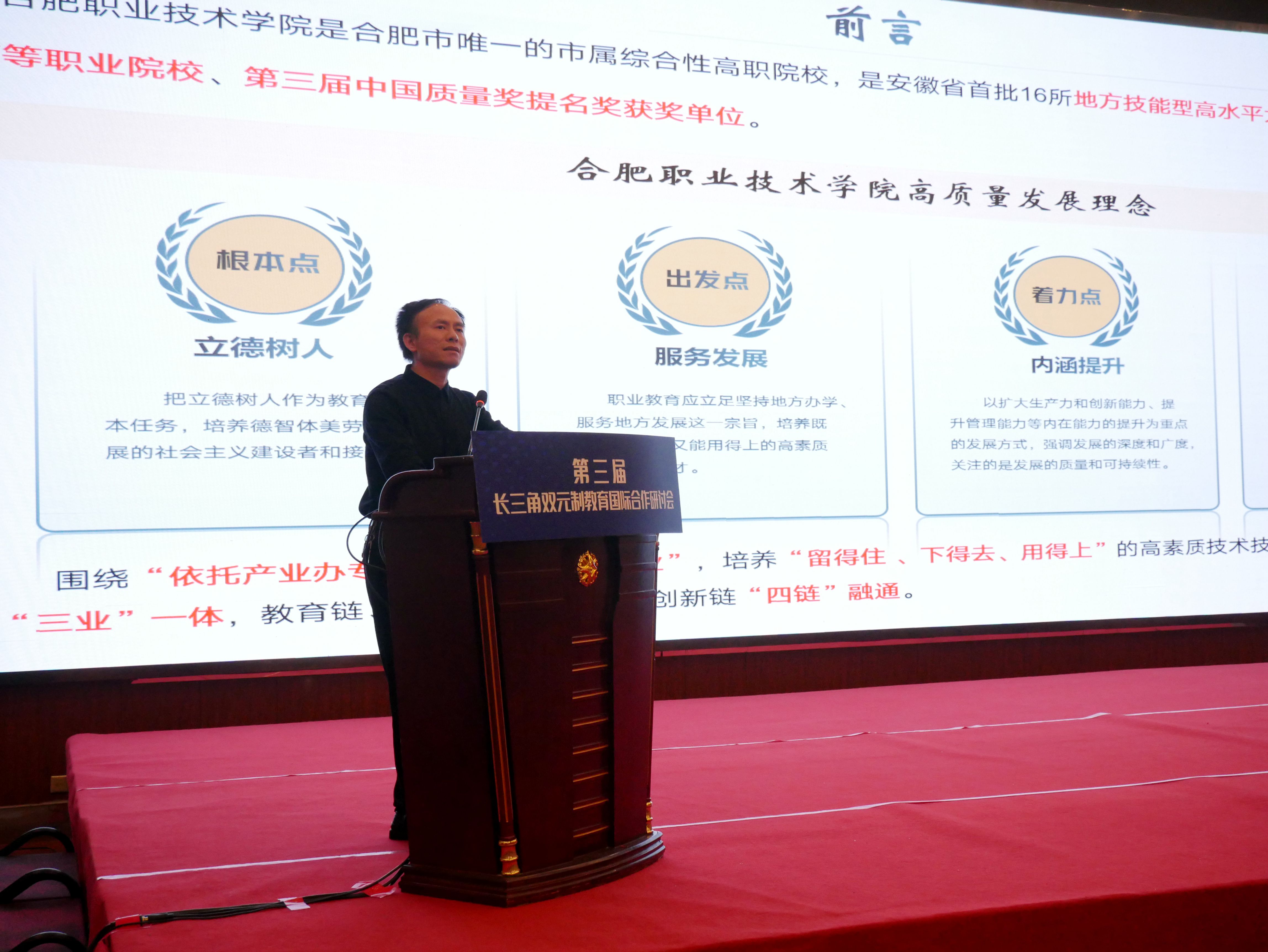 11月24日,由安徽省教育厅、江苏省教育厅、浙江省教育厅、上海市教育委员会共同主办,我校和合肥学院、合肥工业学校共同承办的第三届长三角双元制教育国际合作研讨会在合肥召开。长三角三省一市81所应用型本科院校、高等职业院校、中等职业学校、企业以及沪苏浙皖教育主管部门共180多名代表参加会议。