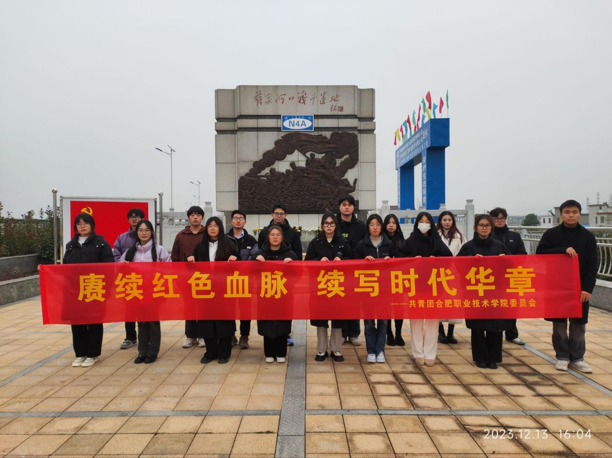 随后,同学们来到了巢湖市爱国主义教育基地蒋家河口战斗遗址。在遗址前,所有人员列队肃穆地站立在遗址广场纪念碑前,聆听蒋家河口战斗故事,逐一向纪念碑敬献鲜花,全体人员面对纪念碑,向抗日先烈鞠躬。