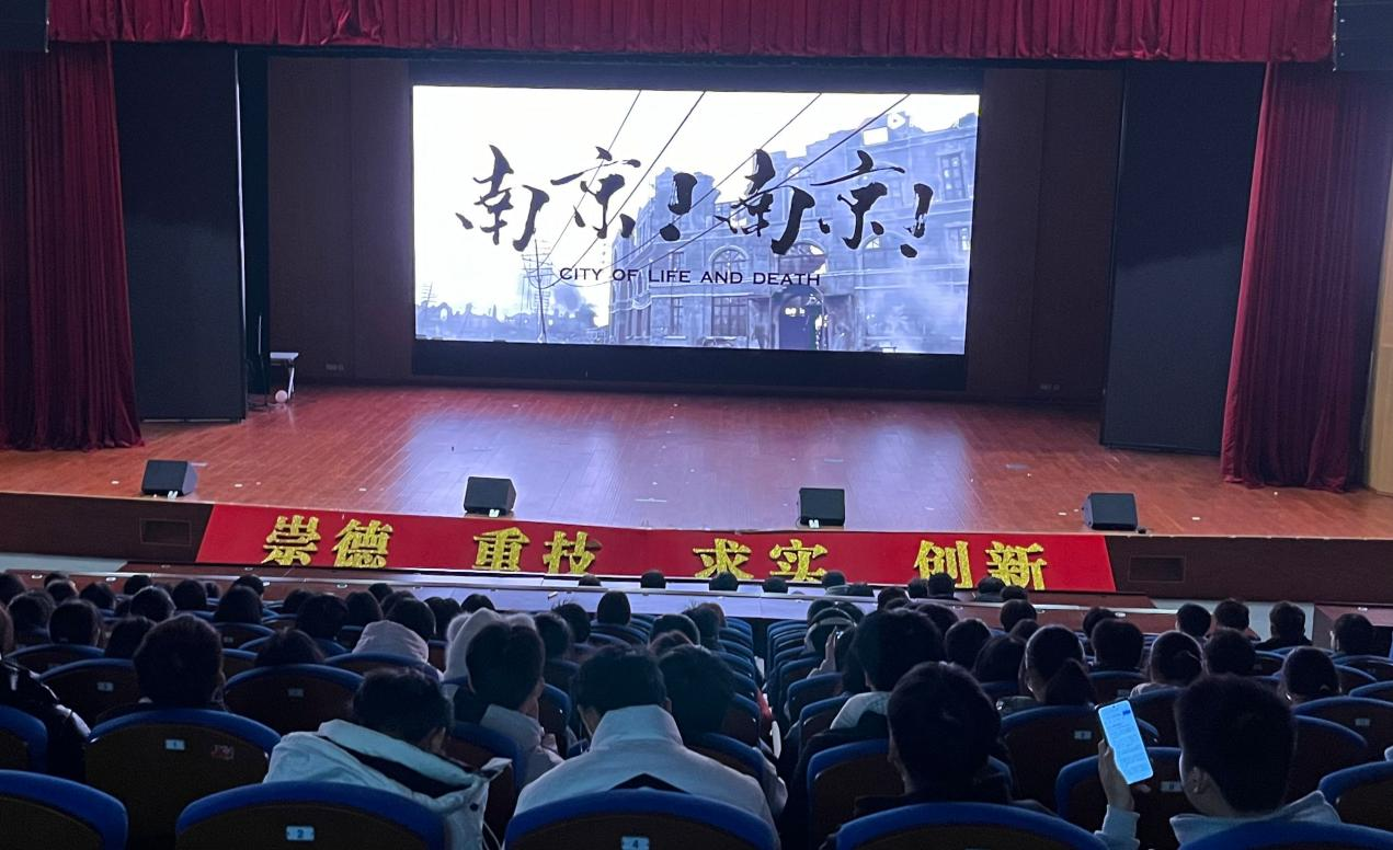 汇心湖校区学生会开展了以“铭记历史,勿忘国耻”纪念国家公祭日观影活动。活动于中午1点在大学生活动中心二楼大礼堂举行,播放的影片为《南京!南京!》。整个观影过程,全体学生严肃悲怆。电影全篇黑白色调,还原了南京大屠杀下的部分场景,一幕幕触目惊心的真实场景,让同学们对南京大屠杀的惨痛历史有了更深刻的认识,更加直观地感受到了那一组组数字背后的意义。