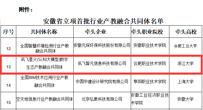 近日,安徽省教育厅公布了安徽省首批行业产教融合共同体培育建设项目名单,前期经企业自愿申报、市级教育行政部门初审推荐、省内外专家线上线下评审等程序,由我校为牵头职业学校、浙江大学为牵头高水平大学、讯飞智元信息科技有限公司为牵头企业的“讯飞星火(认知大模型)数字生态产教融合共同体”成功入选安徽省首批行业产教融合共同体培育建设项目。